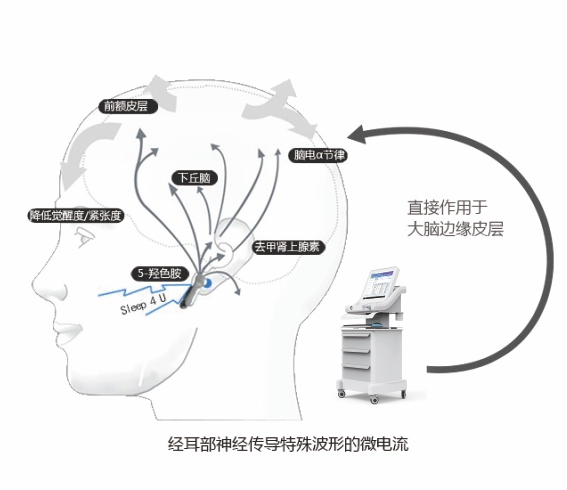 经颅微电流刺激疗法(Cranial electrotherapy stimulation, 简称CES),通过耳垂根部的耳夹电极产生低强度微电流刺激大脑,改善异常脑电波,调节大脑神经递质和应激激素的分泌,从而达到治疗的目的。
